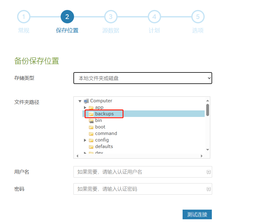 存储路径选择 本地文件夹或磁盘,文件夹路径设 置为: 【Computer】>【backups】