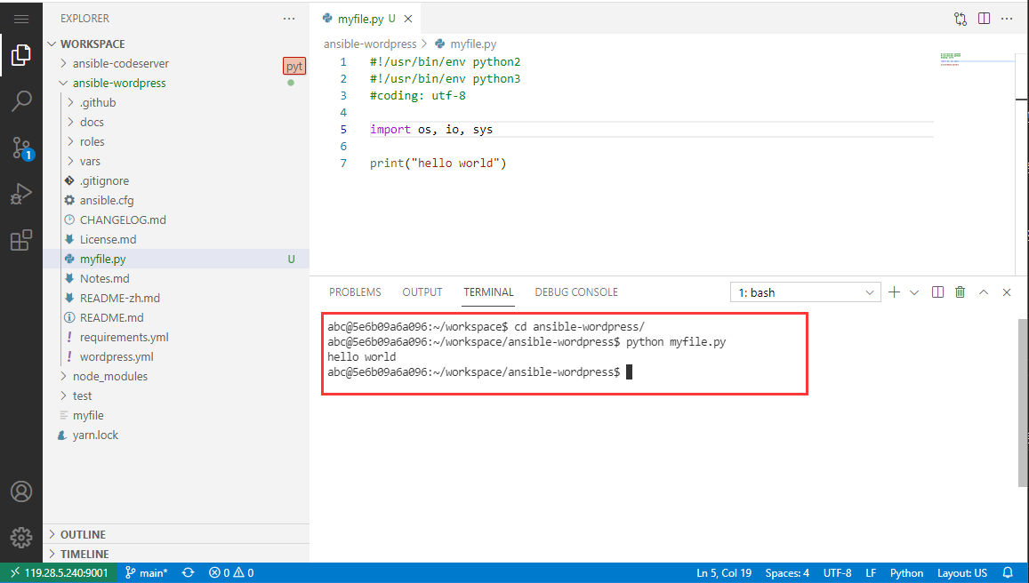 在 code-server 后台,依次点击:View > Terminal,在 Terminal 区域输入测试命令