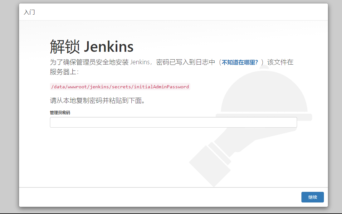 使用本地电脑浏览器访问,进入初始化页面,Jenkins 提示需要解锁