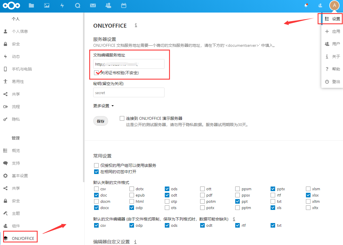 Nextcloud 控制台右上角齿轮图标,点击 管理设置,找到 ONLYOFFICE 设置项,集成 ONLYOFFICE