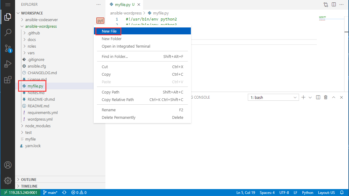 1. Log in to code-server, create a new folder and file named: myfile.py, and copy the following Python example code into the file.